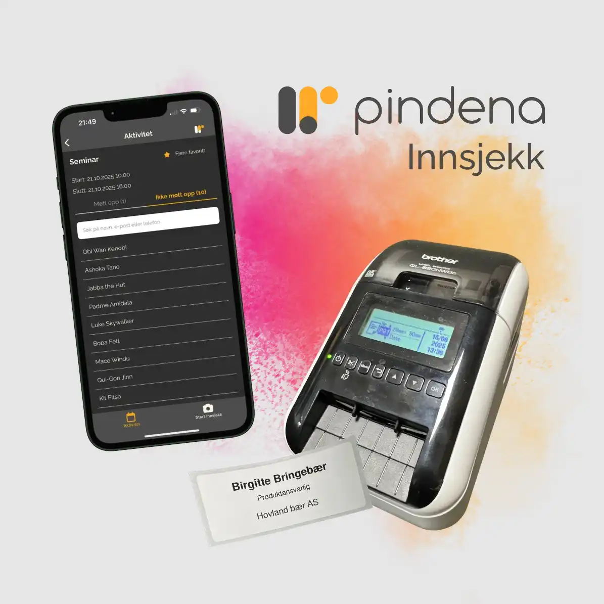 Pindena Innsjekk er en effektiv måte å registrere oppmøte av deltagere. Med automatisk utskrift av navnelapper, gjør du innsjekk og utdeling av navnelapper i samme prosess – helt