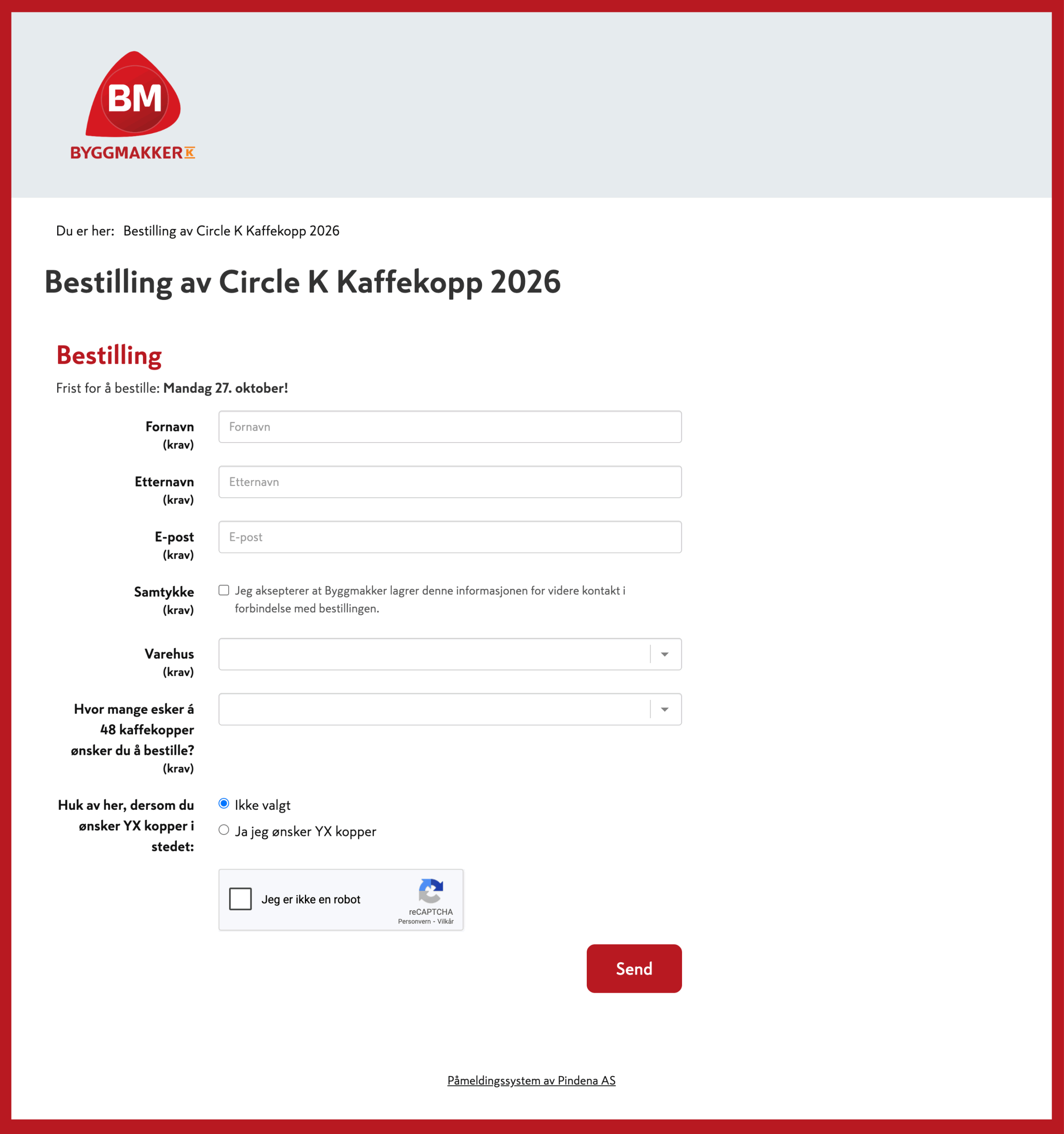 Byggmakker er en stor byggevarekjede som inviterer til flere type arrangementer hvert år. De har mange arrangementer for proffkunder i tillegg til aktiviteter for ansatte og kunder i regionene. For over 10 år siden brukte Byggmakker Pindena for påmelding til Damenes aften og Guttas kveld. De har utviklet flere konsepter, og for noen år siden meldte behovet seg igjen for et påmeldingssystem.